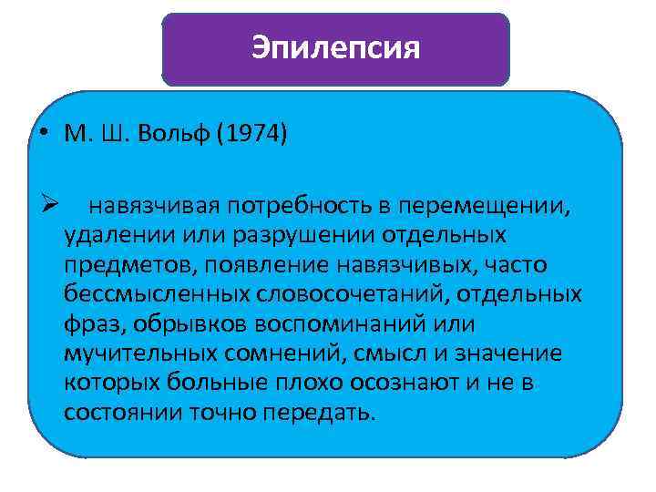 Эпилепсия • М. Ш. Вольф (1974) Ø навязчивая потребность в перемещении, удалении или разрушении отдельных предметов, появление навязчивых, часто бессмысленных словосочетаний, отдельных фраз, обрывков воспоминаний или мучительных сомнений, смысл и значение которых больные плохо осознают и не в состоянии точно передать.
