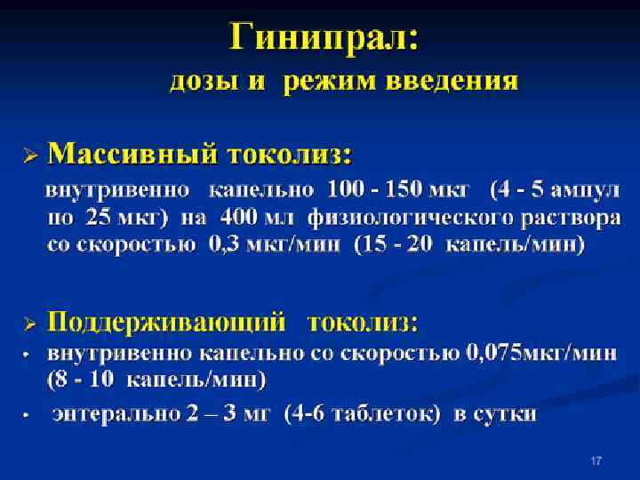 Токолиз: -симпатомиметики Мониторинг при токолизе 1. ЧСС беременной: тахикардия > 130 уд/мин, беспокойство, тремор, потливость, головокружение - отмена препарата 2. ЧСС плода: тахикардия > 180 -200 уд/мин - уменьшение скорости введения 3. Систолическое АД - не должно повышаться > 20 мм рт ст и понижаться > 35 мм рт ст. Профилактика гипотензии положение беременной на боку не менее 15 4. Диастолическое АД - не должно снижаться > 20 мм рт ст 5. Изолированная головная боль при введении препарата значение только при гипертензии 6. Контроль объема вводимой жидкости и диуреза 7. ЭКГ в динамике