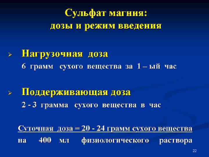Токолиз: cульфат магния Некоторые авторы (Hollander, 1987) предпочитают его токолитикам. Механизмы окончательно не определены Методика: начальная доза 4 г в/в за 30 минут (6 г - Sibai, 1989) проявления периферической вазодилятации, рвота поддерживающая доза - 0. 5 - 2 г/час до 12 часов далее - -адреномиметики per os Противопоказания: myasthenua gravis нарушения проводимости в виде блокад инфаркт миокарда в анамнезе тяжелое поражение почек Не сочетают с в/в введением -адреномиметиков Антидот - глюконат, хлорид кальция 1 г