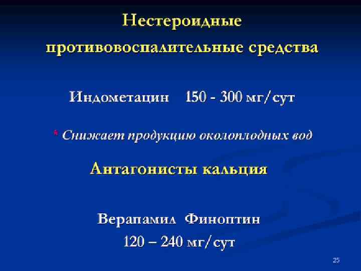 Токолиз: ингибиторы простагландин-синтетазы Индометацин Очень краткие курсы (24 -48 часов) при беременности < 34 нед. : 100 мг per rectum + 25 мг per os каждые 6 часов (max 200 мг) возможно вместе с Maalox Противопоказания: гематологические нарушения язвенная болезнь Лимитирующий фактор - безопасность в отношении плода - преждевременное закрытие артериального протока вероятность выше в поздние сроки беременности, - правожелудочковая СН и гибель (Csaba, 1978; Itskovitz, 1980) - олигурия (попытки лечения идиопатического многоводия Kirshon, 1990) - легочная гипертензия у новорожденных - cлучаи перфорации кишечника (Vanhaesebrouck, 1988) Осложнения у матери: гастроинтестинальные кровотечения, редкие - почечная недостаточность, гепатит Не влияет на плацентарную перфузию