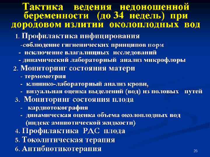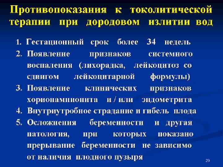 Токолиз: -симпатомиметики Противопоказания (Абрамченко В. В. , 1996): 1. Гипертензия свыше 150/90 мм рт ст и выше 2. Отслойка плаценты и кровотечения из половых путей неясной этиологии 3. Аномалии развития плода, несовместимые с жизнью 4. Мертвый плод 5. Хориоамнионит 6. Пороки сердца (включая ревматические и врожденные) тахиаритмия, миокардиты, кардиомиопатии 7. Тиреотоксикоз 8. Сахарный диабет 9. Заболевания почек и печени 10. Глаукома 11. Выраженный ацидоз у плода 12. Высокая температура или гипоксия у матери 13. Раскрытие маточного зева на 5 см и более