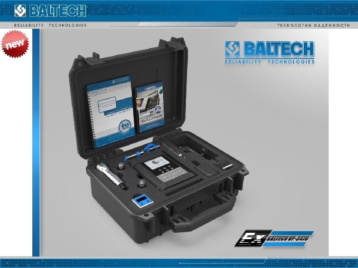Technical characteristics of BALTECH VP-3470 -Ех Spectral analysis 200, 500, 1000, 2000, 5000, 10000 border frequencies, Hz Quantity of lines 400, 800, 1600 Windows Square, Hanning, Blackman-Hemming Dynamic range, d. B Not less 75 Detector of envelope with band pass filters 2/3 octave, Hz 4000, 5000, 6300, 8000 1/1 octave, Hz 4000, 5000, 6300, 8000 Amplitude measurement and phases for balancing Revolution range, Hz 1 - 400 Tolerance on frequency, % +/- 1 Tolerance on phase, degree +/- 5 Tolerance on amplitude, d. B +/- 1 Automated checkout Sensor connection control Amplitude units of measurement d. B, g, m/s 2, mm/s, micron Range of measurements Vibrational acceleration, m/s 2 2. . . 10000 Vibration speed, mm/s 10. . . 2000 Vibration displacement, micron 10. . . 1000
