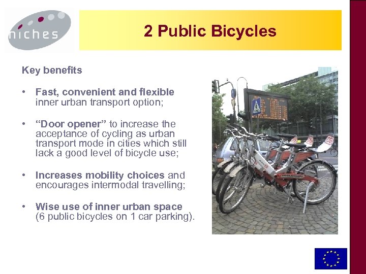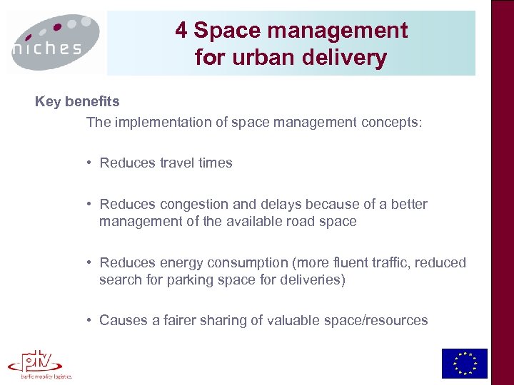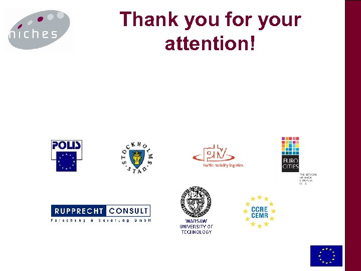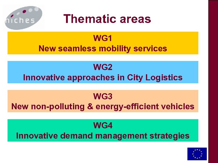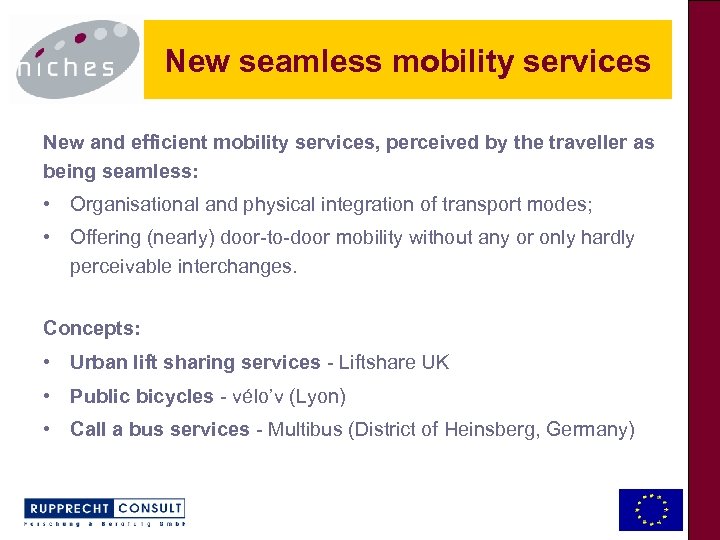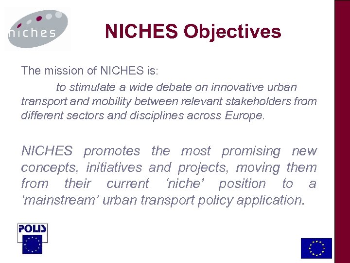 NICHES Objectives The mission of NICHES is: to stimulate a wide debate on innovative urban transport and mobility between relevant stakeholders from different sectors and disciplines across Europe. NICHES promotes the most promising new concepts, initiatives and projects, moving them from their current ‘niche’ position to a ‘mainstream’ urban transport policy application.