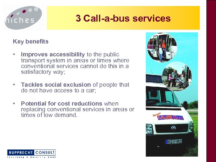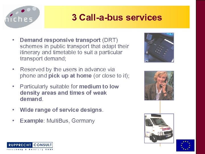 3 Call-a-bus services 3 Call a busservices • Demand responsive transport (DRT) schemes in public transport that adapt their itinerary and timetable to suit a particular transport demand; • Reserved by the users in advance via phone and pick up at home (or close to it); • Particularly suitable for medium to low density areas and times of weak demand. • Wide range of service designs. • Example: Multi. Bus, Germany