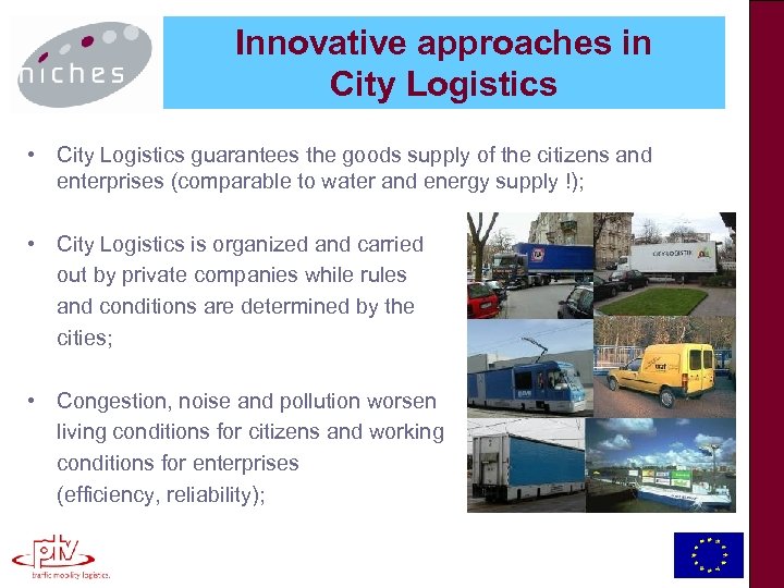 Innovative approaches in City Logistics • City Logistics guarantees the goods supply of the citizens and enterprises (comparable to water and energy supply !); • City Logistics is organized and carried out by private companies while rules and conditions are determined by the cities; • Congestion, noise and pollution worsen living conditions for citizens and working conditions for enterprises (efficiency, reliability);