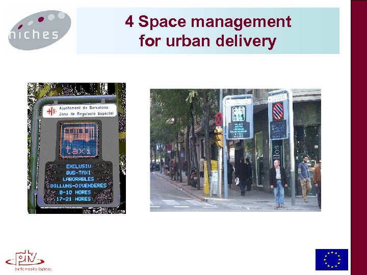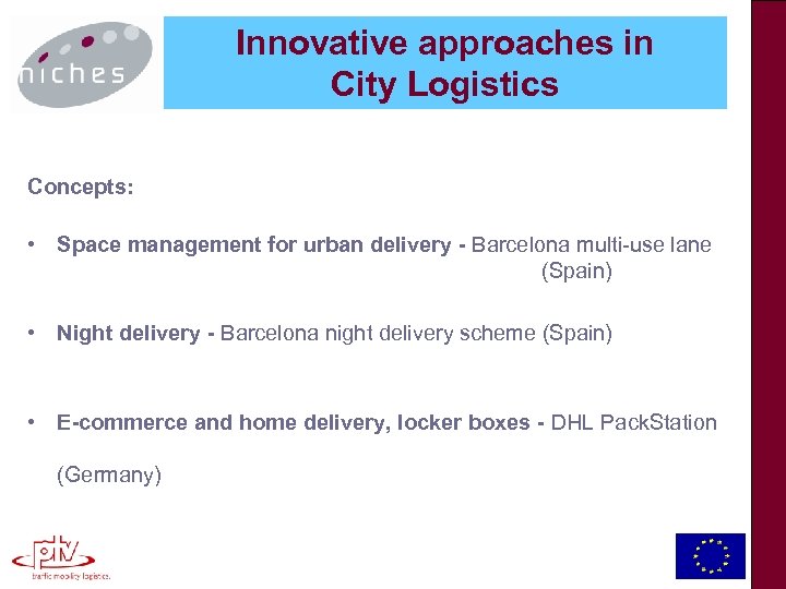 Innovative approaches in City Logistics Concepts: • Space management for urban delivery - Barcelona multi-use lane (Spain) • Night delivery - Barcelona night delivery scheme (Spain) • E-commerce and home delivery, locker boxes - DHL Pack. Station (Germany)