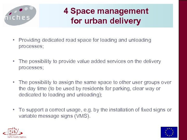 4 Space management for urban delivery • Providing dedicated road space for loading and unloading processes; • The possibility to provide value added services on the delivery processes; • The possibility to assign the same space to other user groups over the day time (to be used by residents for parking, clear way or dedicated to loading and unloading); • To support a correct usage, e. g. by the installation of fixed signs or variable message signs (VMS).