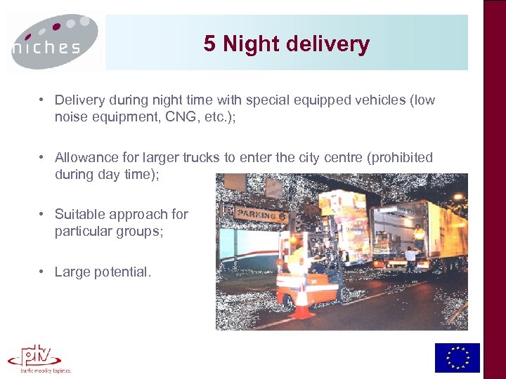 5 Night delivery • Delivery during night time with special equipped vehicles (low noise equipment, CNG, etc. ); • Allowance for larger trucks to enter the city centre (prohibited during day time); • Suitable approach for particular groups; • Large potential.