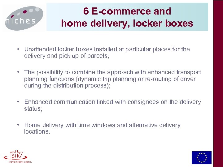 6 E-commerce and home delivery, locker boxes • Unattended locker boxes installed at particular places for the delivery and pick up of parcels; • The possibility to combine the approach with enhanced transport planning functions (dynamic trip planning or re-routing of driver during the distribution process); • Enhanced communication linked with consignees on the delivery status; • Home delivery with time windows and alternative delivery locations.