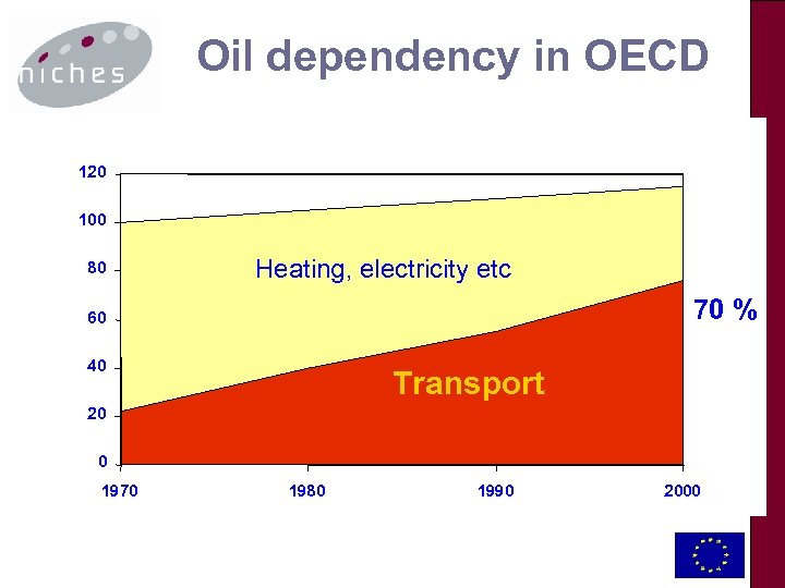 Oil dependency in OECD 120 100 80 Heating, electricity etc 70 % 60 40 Transport 20 0 1970 1980 1990 2000