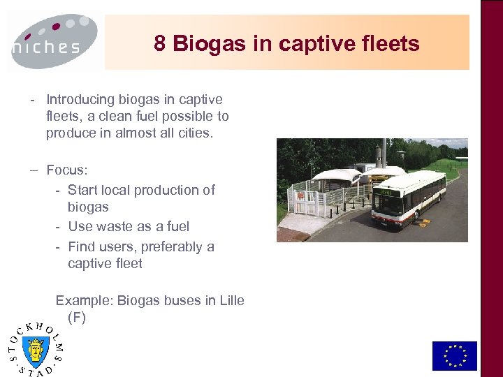 8 Biogas in captive fleets - Introducing biogas in captive fleets, a clean fuel possible to produce in almost all cities. – Focus: - Start local production of biogas - Use waste as a fuel - Find users, preferably a captive fleet Example: Biogas buses in Lille (F) Add your logo