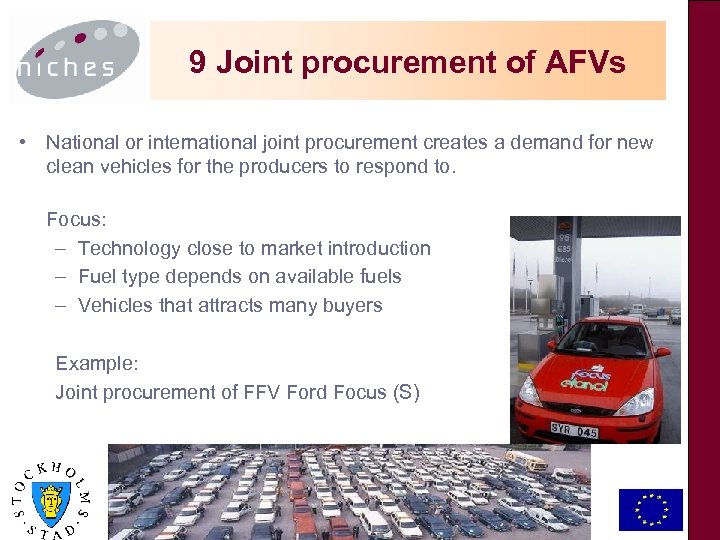 New non-polluting & energy-efficient vehicles Increase use of clean and energy efficient vehicles on alternative fuels • Introduce infrastructure for alternative fuels and work towards a supply of clean vehicles – for everyone to choose • Start with larger fleet owners 7. Policy Strategy to deploy private sector AFVs (Clean vehicles in Stockholm (S)) 8. Biogas in captive fleets. (Biogas buses in Lille (F)) 9. Joint procurement of AFVs (Joint procurement of Ford Focus FFV (S))