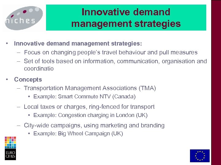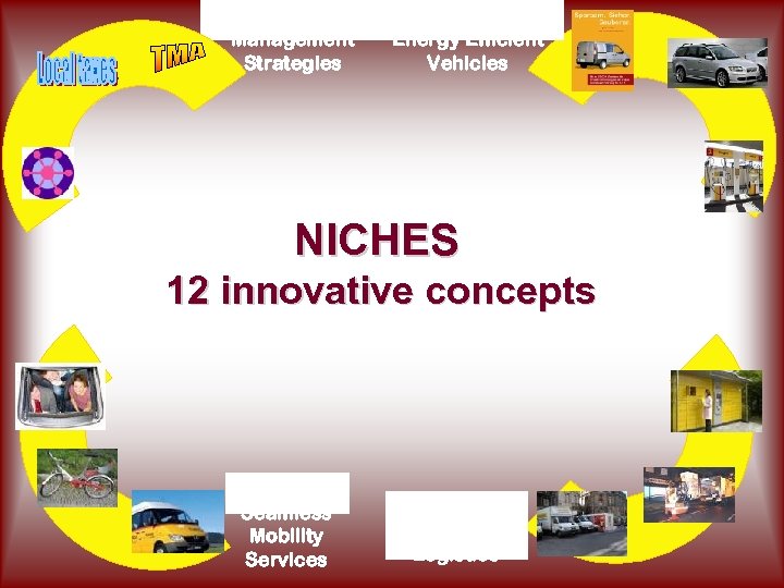 Demand Management Strategies Non-Polluting & Energy Efficient Vehicles NICHES 12 innovative concepts New Seamless Mobility Services Innovative City Logistics