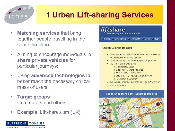 1 Urban Lift-sharing Services • Matching services that bring together people travelling in the same direction; • Aiming to encourage individuals to share private vehicles for particular journeys; • Using advanced technologies to better reach the necessary critical mass of users; • Target groups: Commuters and others • Example: Liftshare. com (UK)