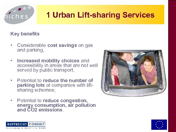 1 Urban Lift-sharing Services Key benefits • Considerable cost savings on gas and parking, • Increased mobility choices and accessibility in areas that are not well served by public transport, • Potential to reduce the number of parking lots at companies with liftsharing schemes; • Potential to reduce congestion, energy consumption, air pollution and CO 2 emissions.