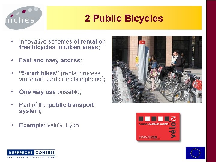 2 Public bicycles 2 Public Bicycles • Innovative schemes of rental or free bicycles in urban areas; • Fast and easy access; • “Smart bikes” (rental process via smart card or mobile phone); • One way use possible; • Part of the public transport system; • Example: vélo’v, Lyon