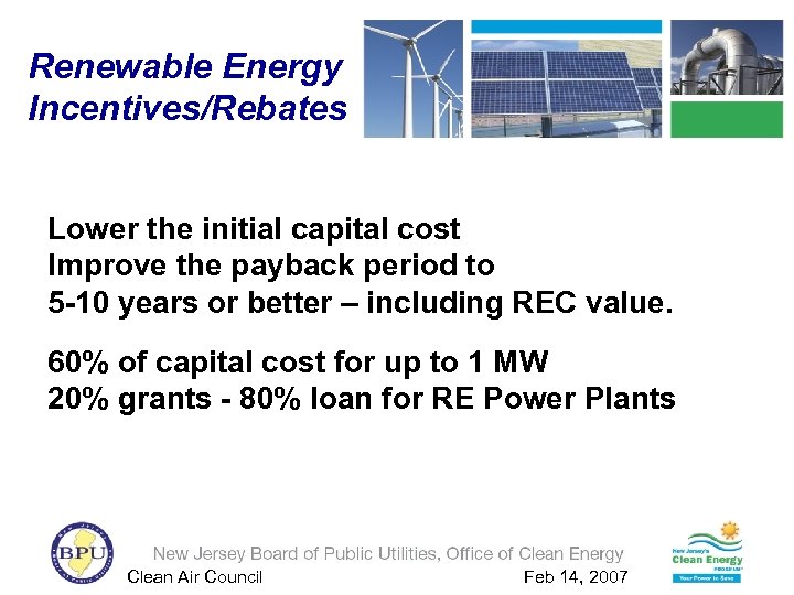 Renewable Energy Incentives/Rebates Lower the initial capital cost Improve the payback period to 5 -10 years or better – including REC value. 60% of capital cost for up to 1 MW 20% grants - 80% loan for RE Power Plants Clean Air Council Feb 14, 2007