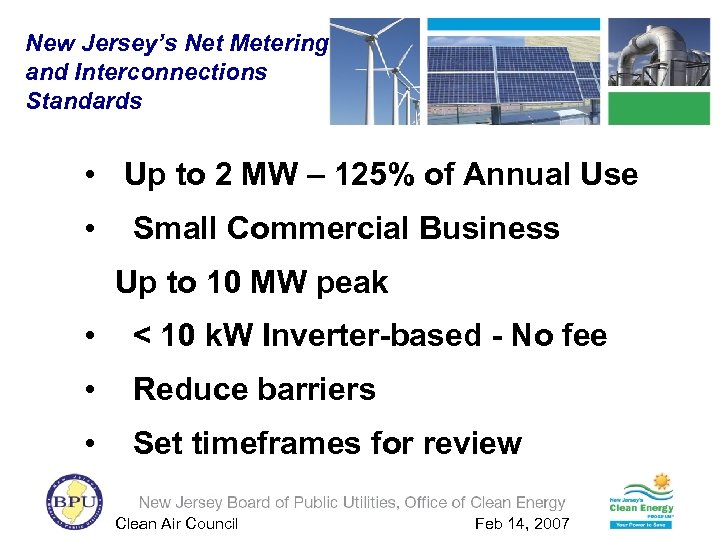 New Jersey’s Net Metering and Interconnections Standards • Up to 2 MW – 125% of Annual Use • Small Commercial Business Up to 10 MW peak • < 10 k. W Inverter-based - No fee • Reduce barriers • Set timeframes for review Clean Air Council Feb 14, 2007
