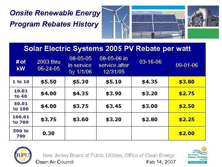 Onsite Renewable Energy Program Rebates History Solar Electric Systems 2005 PV Rebate per watt 08 -05 -05 08 -05 -06 in in service after by 1/1/06 12/31/05 # of k. W 2003 thru 06 -24 -05 1 to 10 $5. 50 $5. 30 $5. 10 $4. 35 $3. 80 10. 01 to 40 $4. 00 $4. 35 $3. 90 $3. 20 $2. 75 40. 01 to 100 $4. 00 $3. 75 $3. 45 $3. 00 $2. 50 100. 01 to 700 $3. 75 $3. 60 $3. 20 $2. 80 $2. 25 500 to 700 0. 30 Clean Air Council 03 -16 -06 09 -01 -06 $2. 00 Feb 14, 2007