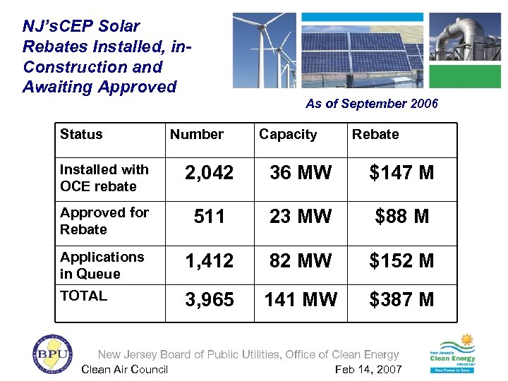 NJ’s. CEP Solar Rebates Installed, in. Construction and Awaiting Approved As of September 2006 Status Number Capacity Rebate Installed with OCE rebate 2, 042 36 MW $147 M Approved for Rebate 511 23 MW $88 M Applications in Queue 1, 412 82 MW $152 M TOTAL 3, 965 141 MW $387 M Clean Air Council Feb 14, 2007