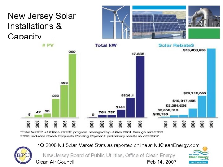 New Jersey Solar Installations & Capacity 4 Q 2006 NJ Solar Market Stats as reported online at NJClean. Energy. com Clean Air Council Feb 14, 2007