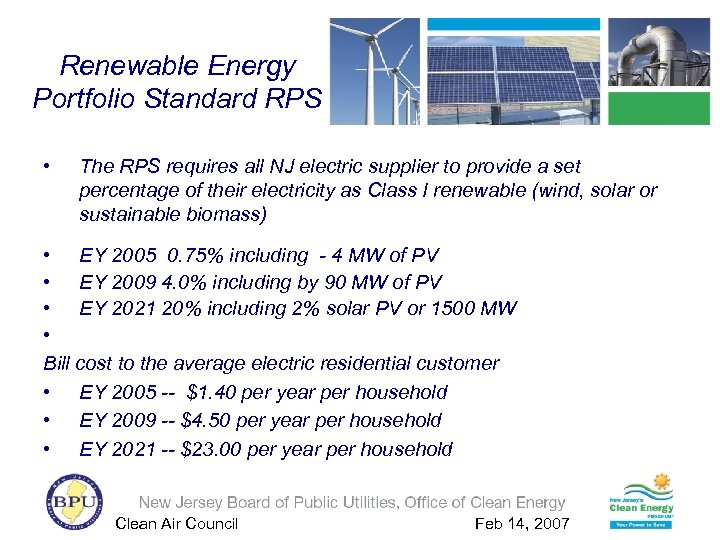 Renewable Energy Portfolio Standard RPS • The RPS requires all NJ electric supplier to provide a set percentage of their electricity as Class I renewable (wind, solar or sustainable biomass) • EY 2005 0. 75% including - 4 MW of PV • EY 2009 4. 0% including by 90 MW of PV • EY 2021 20% including 2% solar PV or 1500 MW • Bill cost to the average electric residential customer • EY 2005 -- $1. 40 per year per household • EY 2009 -- $4. 50 per year per household • EY 2021 -- $23. 00 per year per household Clean Air Council Feb 14, 2007
