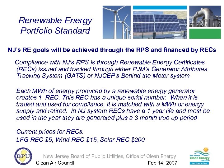 Renewable Energy Portfolio Standard NJ’s RE goals will be achieved through the RPS and financed by RECs Compliance with NJ’s RPS is through Renewable Energy Certificates (RECs) issued and tracked through either PJM’s Generator Attributes Tracking System (GATS) or NJCEP’s Behind the Meter system Each MWh of energy produced by a renewable energy generator creates 1 REC. This REC has a unique serial number. When it is traded and used for compliance, it is matched with a MWh or energy supply and retired. In NJ system RECs have a 1 year life and most be used in the year they are generated plus a 3 month true up period Current prices for RECs: LFG REC $5, Wind REC $15, Solar REC $200 Clean Air Council Feb 14, 2007