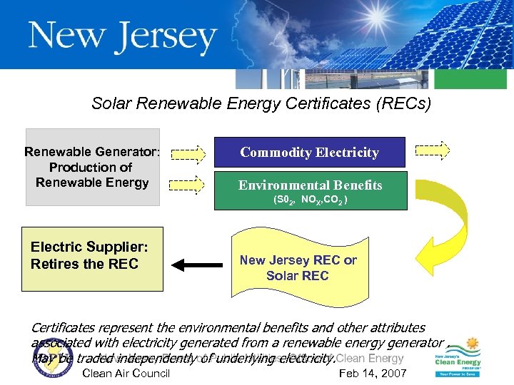 Solar Renewable Energy Certificates (RECs) Renewable Generator: Production of Renewable Energy Commodity Electricity Environmental Benefits (S 02, NOX, CO 2 ) Electric Supplier: Retires the REC New Jersey REC or Solar REC Certificates represent the environmental benefits and other attributes associated with electricity generated from a renewable energy generator. May be traded independently of underlying electricity. Clean Air Council Feb 14, 2007