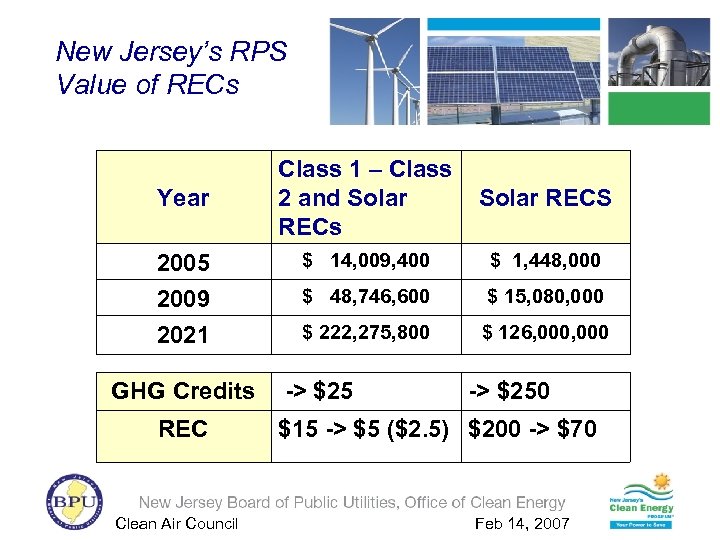 New Jersey’s RPS Value of RECs Year Class 1 – Class 2 and Solar RECs Solar RECS 2005 $ 14, 009, 400 $ 1, 448, 000 2009 2021 $ 48, 746, 600 $ 15, 080, 000 $ 222, 275, 800 $ 126, 000 GHG Credits REC Clean Air Council -> $250 $15 -> $5 ($2. 5) $200 -> $70 Feb 14, 2007