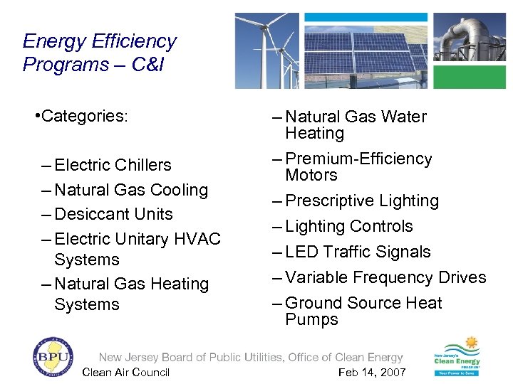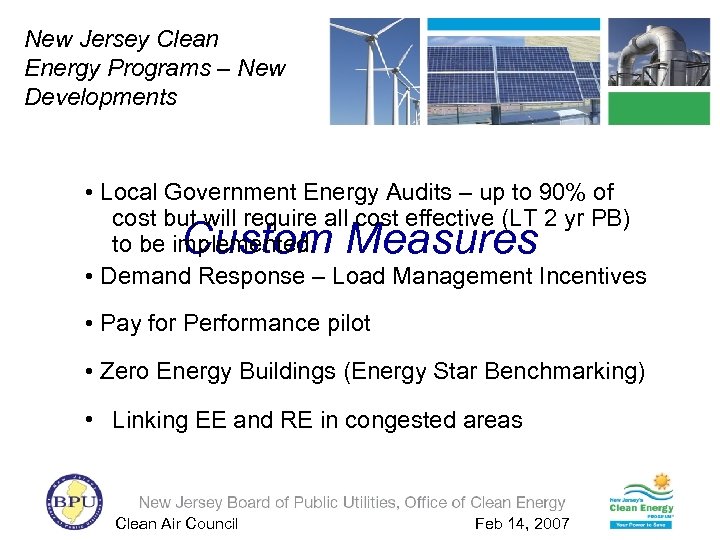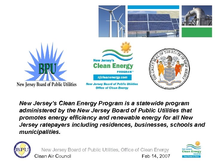 New Jersey’s Clean Energy Program is a statewide program administered by the New Jersey Board of Public Utilities that promotes energy efficiency and renewable energy for all New Jersey ratepayers including residences, businesses, schools and municipalities. Clean Air Council Feb 14, 2007