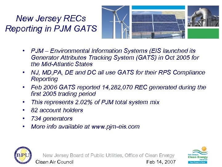 New Jersey RECs Reporting in PJM GATS • PJM – Environmental Information Systems (EIS launched its Generator Attributes Tracking System (GATS) in Oct 2005 for the Mid-Atlantic States • NJ, MD, PA, DE and DC all use GATS for their RPS Compliance Reporting • Feb 2006 GATS reported 14, 282, 070 REC generated during the first 2005 trading period • This represents 2. 02% of PJM total system mix • 82 account holders • 734 generators • More info available at www. pjm-eis. com Clean Air Council Feb 14, 2007