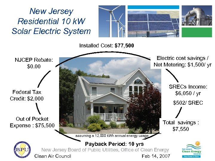 New Jersey Residential 10 kw Solar Electric System Installed Cost: $77, 500 Electric cost savings / Net Metering: $1, 500/ yr NJCEP Rebate: $38, 000 Insert Residential Home Federal Tax Credit: $2, 000 Out of Pocket Expense: $37, 500 Total savings : $1, 500 assuming a 12, 000 k. Wh annual energy usage Payback Period: 25 yrs Clean Air Council Feb 14, 2007