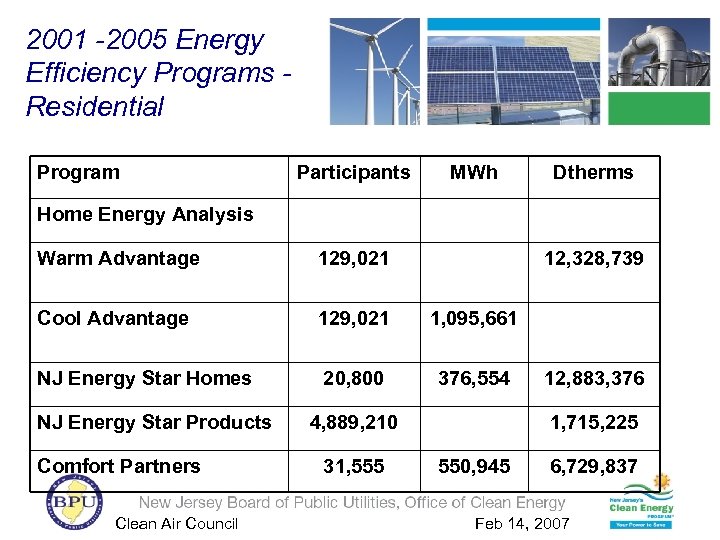 2001 -2005 Energy Efficiency Programs Residential Program Participants MWh Dtherms Home Energy Analysis Warm Advantage 129, 021 Cool Advantage 129, 021 1, 095, 661 NJ Energy Star Homes 20, 800 376, 554 NJ Energy Star Products Comfort Partners Clean Air Council 12, 328, 739 4, 889, 210 31, 555 12, 883, 376 1, 715, 225 550, 945 6, 729, 837 Feb 14, 2007