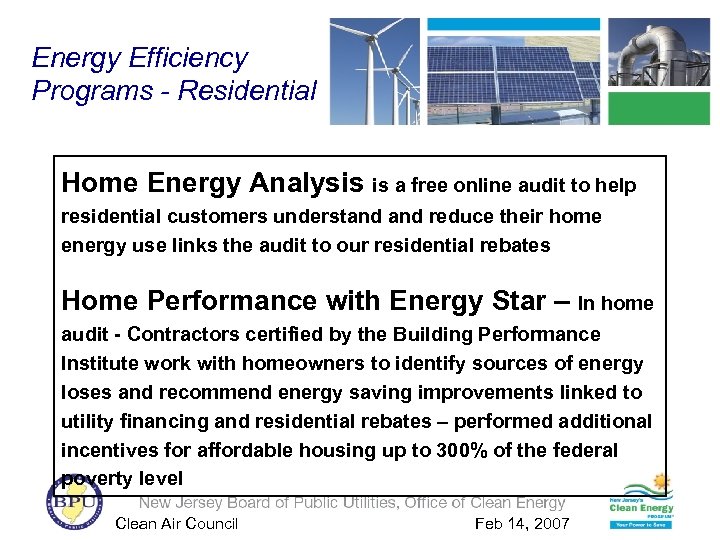 Energy Efficiency Programs - Residential Home Energy Analysis is a free online audit to help residential customers understand reduce their home energy use links the audit to our residential rebates Home Performance with Energy Star – In home audit - Contractors certified by the Building Performance Institute work with homeowners to identify sources of energy loses and recommend energy saving improvements linked to utility financing and residential rebates – performed additional incentives for affordable housing up to 300% of the federal poverty level Clean Air Council Feb 14, 2007