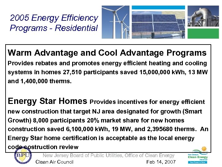 2005 Energy Efficiency Programs - Residential Warm Advantage and Cool Advantage Programs Provides rebates and promotes energy efficient heating and cooling systems in homes 27, 510 participants saved 15, 000 k. Wh, 13 MW and 1, 400, 000 therms. Energy Star Homes Provides incentives for energy efficient new construction that target NJ area designated for growth (Smart Growth) 8, 000 participants 20% market share for new homes construction saved 6, 100, 000 k. Wh, 19 MW, and 2, 395680 therms. An Energy Star home certification is acceptable as the local energy code costruction review Clean Air Council Feb 14, 2007