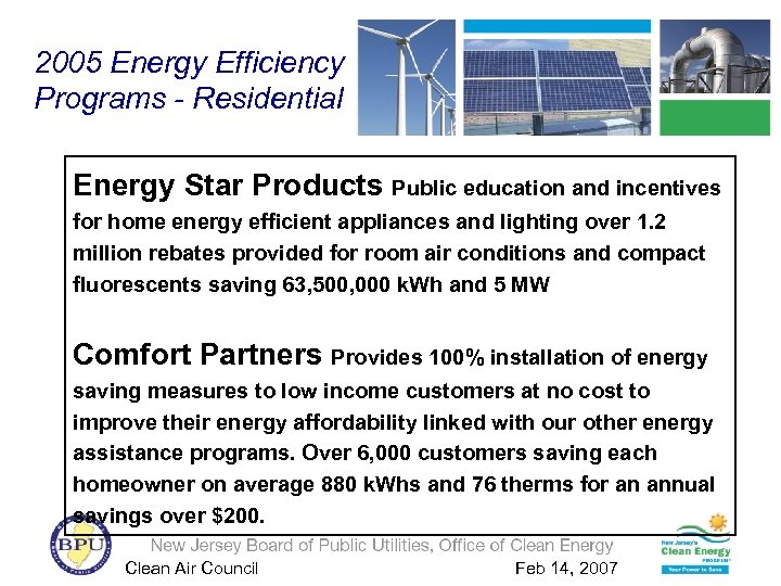 2005 Energy Efficiency Programs - Residential Energy Star Products Public education and incentives for home energy efficient appliances and lighting over 1. 2 million rebates provided for room air conditions and compact fluorescents saving 63, 500, 000 k. Wh and 5 MW Comfort Partners Provides 100% installation of energy saving measures to low income customers at no cost to improve their energy affordability linked with our other energy assistance programs. Over 6, 000 customers saving each homeowner on average 880 k. Whs and 76 therms for an annual savings over $200. Clean Air Council Feb 14, 2007