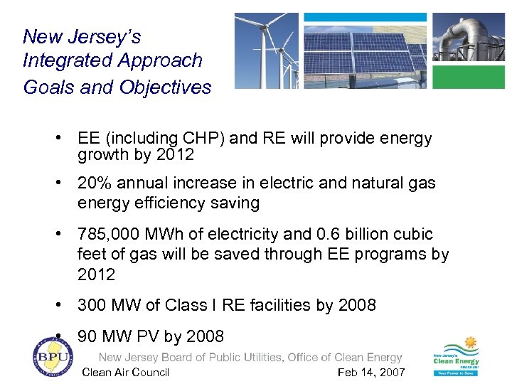 New Jersey’s Integrated Approach Goals and Objectives • EE (including CHP) and RE will provide energy growth by 2012 • 20% annual increase in electric and natural gas energy efficiency saving • 785, 000 MWh of electricity and 0. 6 billion cubic feet of gas will be saved through EE programs by 2012 • 300 MW of Class I RE facilities by 2008 • 90 MW PV by 2008 Clean Air Council Feb 14, 2007