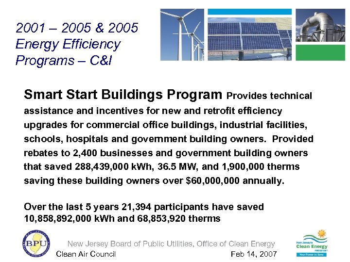 2001 – 2005 & 2005 Energy Efficiency Programs – C&I Smart Start Buildings Program Provides technical assistance and incentives for new and retrofit efficiency upgrades for commercial office buildings, industrial facilities, schools, hospitals and government building owners. Provided rebates to 2, 400 businesses and government building owners that saved 288, 439, 000 k. Wh, 36. 5 MW, and 1, 900, 000 therms saving these building owners over $60, 000 annually. Over the last 5 years 21, 394 participants have saved 10, 858, 892, 000 k. Wh and 68, 853, 920 therms Clean Air Council Feb 14, 2007