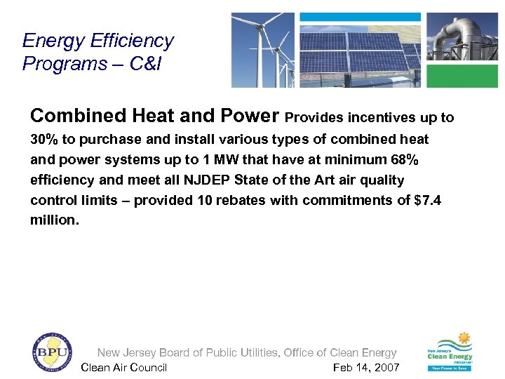 Energy Efficiency Programs – C&I Combined Heat and Power Provides incentives up to 30% to purchase and install various types of combined heat and power systems up to 1 MW that have at minimum 68% efficiency and meet all NJDEP State of the Art air quality control limits – provided 10 rebates with commitments of $7. 4 million. Clean Air Council Feb 14, 2007
