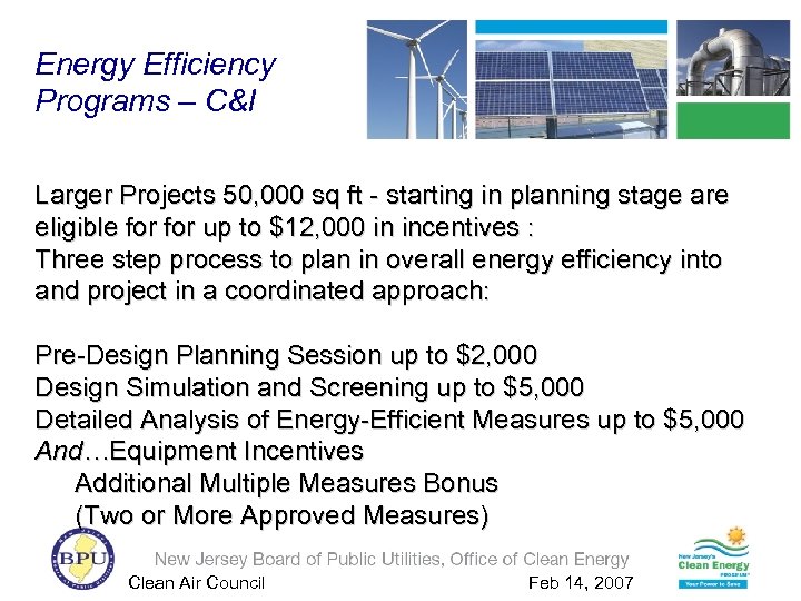 Energy Efficiency Programs – C&I Larger Projects 50, 000 sq ft - starting in planning stage are eligible for up to $12, 000 in incentives : Three step process to plan in overall energy efficiency into and project in a coordinated approach: Pre-Design Planning Session up to $2, 000 Design Simulation and Screening up to $5, 000 Detailed Analysis of Energy-Efficient Measures up to $5, 000 And…Equipment Incentives Additional Multiple Measures Bonus (Two or More Approved Measures) Clean Air Council Feb 14, 2007