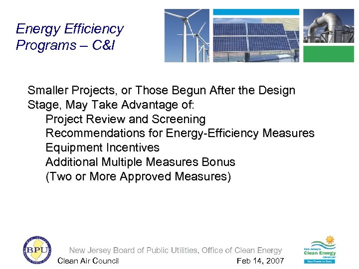 Energy Efficiency Programs – C&I Smaller Projects, or Those Begun After the Design Stage, May Take Advantage of: Project Review and Screening Recommendations for Energy-Efficiency Measures Equipment Incentives Additional Multiple Measures Bonus (Two or More Approved Measures) Clean Air Council Feb 14, 2007