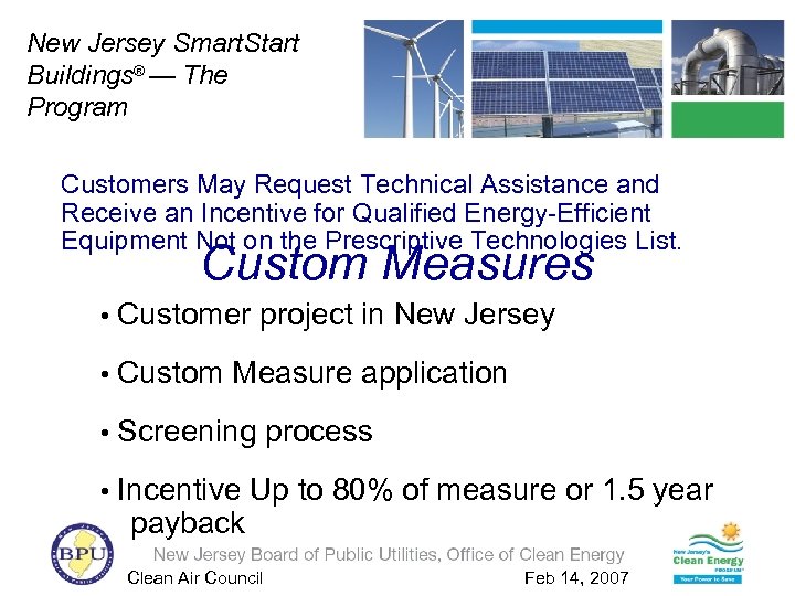 New Jersey Smart. Start Buildings® — The Program Customers May Request Technical Assistance and Receive an Incentive for Qualified Energy-Efficient Equipment Not on the Prescriptive Technologies List. Custom Measures • Customer project in New Jersey • Custom Measure application • Screening process • Incentive Up to 80% of measure or 1. 5 year payback Clean Air Council Feb 14, 2007