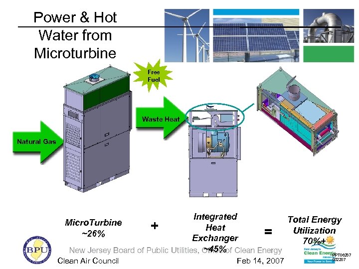 Power & Hot Water from Microturbine Free Fuel Waste Heat Natural Gas Micro. Turbine ~26% Clean Air Council + Integrated Heat Exchanger ~45% = Feb 14, 2007 Total Energy Utilization 70%+ PPT 06287 032207