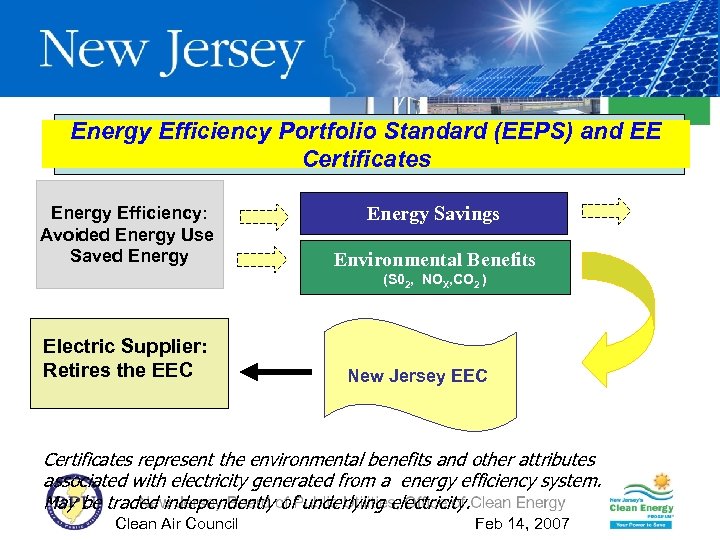 Energy Efficiency Portfolio Standard (EEPS) and EE Certificates Energy Efficiency: Avoided Energy Use Saved Energy Savings Environmental Benefits (S 02, NOX, CO 2 ) Electric Supplier: Retires the EEC New Jersey EEC Certificates represent the environmental benefits and other attributes associated with electricity generated from a energy efficiency system. May be traded independently of underlying electricity. Clean Air Council Feb 14, 2007