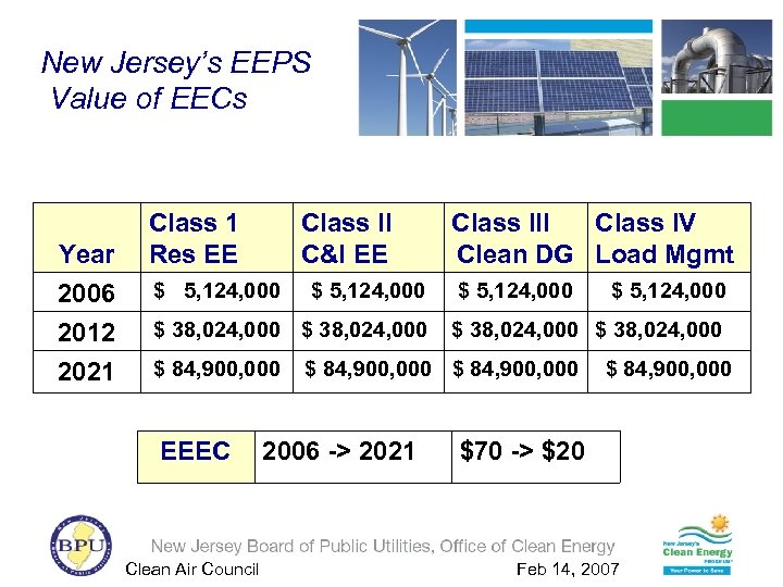 New Jersey’s EEPS Value of EECs Year 2006 2012 2021 Class 1 Res EE Class II C&I EE $ 5, 124, 000 $ 38, 024, 000 $ 84, 900, 000 EEEC $ 5, 124, 000 $ 38, 024, 000 $ 84, 900, 000 2006 -> 2021 Clean Air Council Class III Class IV Clean DG Load Mgmt $ 84, 900, 000 $70 -> $20 Feb 14, 2007