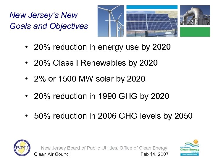 New Jersey’s New Goals and Objectives • 20% reduction in energy use by 2020 • 20% Class I Renewables by 2020 • 2% or 1500 MW solar by 2020 • 20% reduction in 1990 GHG by 2020 • 50% reduction in 2006 GHG levels by 2050 Clean Air Council Feb 14, 2007