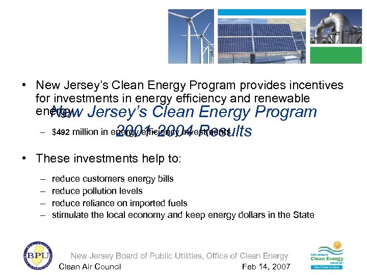 • New Jersey’s Clean Energy Program provides incentives for investments in energy efficiency and renewable energy Jersey’s Clean Energy Program New 2001 -2004 Results – $492 million in energy efficiency investments • These investments help to: – – reduce customers energy bills reduce pollution levels reduce reliance on imported fuels stimulate the local economy and keep energy dollars in the State Clean Air Council Feb 14, 2007