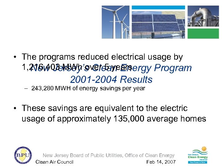 • The programs reduced electrical usage by 1, 216, 403 MWh over 5 years New Jersey’s Clean Energy Program 2001 -2004 Results – 243, 280 MWH of energy savings per year • These savings are equivalent to the electric usage of approximately 135, 000 average homes Clean Air Council Feb 14, 2007