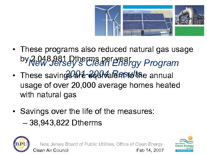 • These programs also reduced natural gas usage by 2, 048, 981 Dtherms per year New Jersey’s Clean Energy Program 2001 -2004 Results • These savings are equivalent to the annual usage of over 20, 000 average homes heated with natural gas • Savings over the life of the measures: – 38, 943, 822 Dtherms Clean Air Council Feb 14, 2007