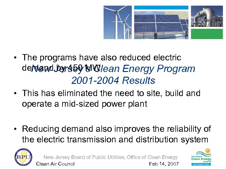 • The programs have also reduced electric demand by 450 MW New Jersey’s Clean Energy Program 2001 -2004 Results • This has eliminated the need to site, build and operate a mid-sized power plant • Reducing demand also improves the reliability of the electric transmission and distribution system Clean Air Council Feb 14, 2007